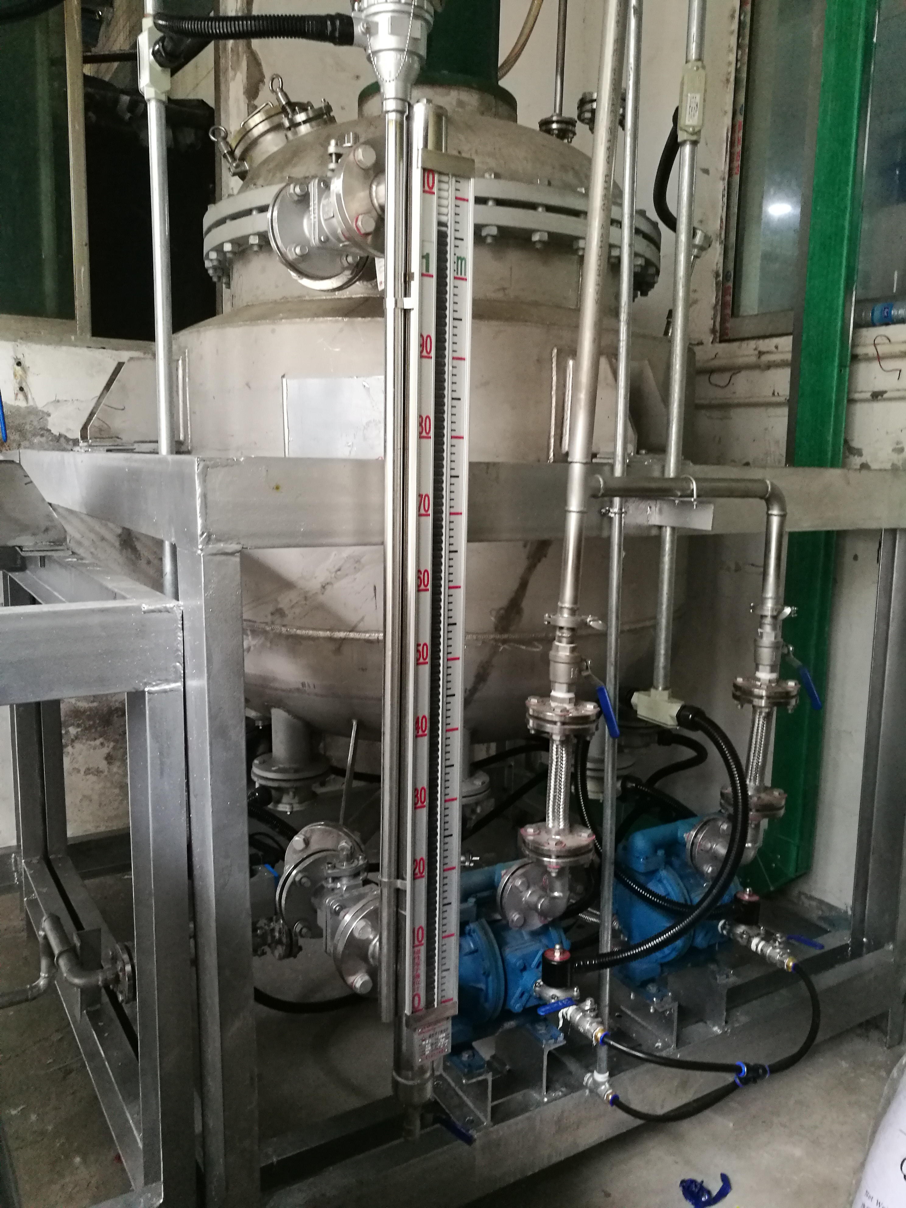 在反應(yīng)釜內(nèi)的濃液被濃縮到飽和時(shí),會(huì)有晶體析出,含晶體的混合液由泵打入離心機(jī)2中進(jìn)行固液分離,卸出的固體物質(zhì)委外處理,另外的飽和液回流至濃液槽中再次進(jìn)入蒸發(fā)器中。而蒸發(fā)出的蒸汽通過冷凝器進(jìn)行冷卻后,形成冷凝水,進(jìn)入回用水箱中,進(jìn)入車間回用。